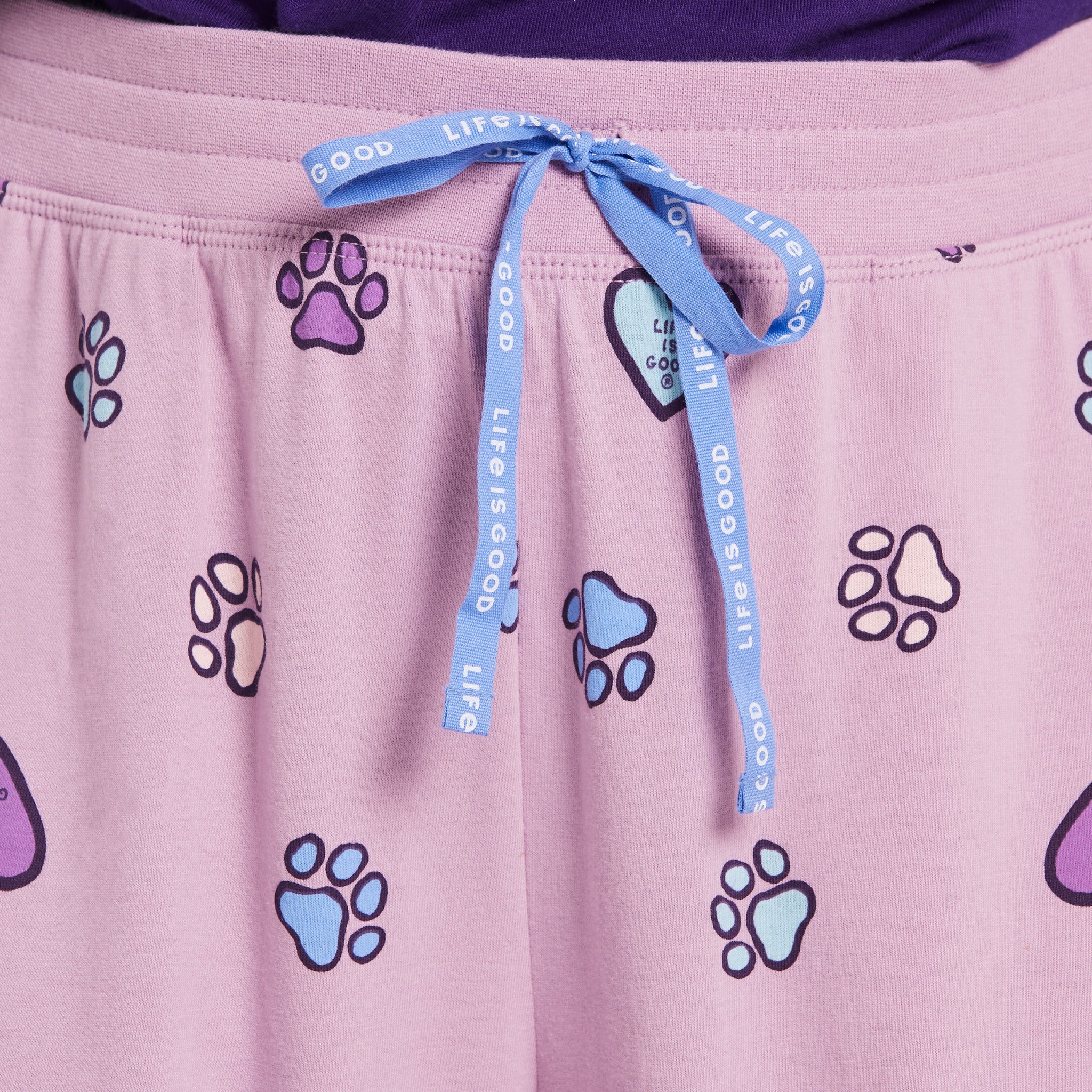 • Elastic encased rib waistband. Twill drawcord with Life Is Good® print.