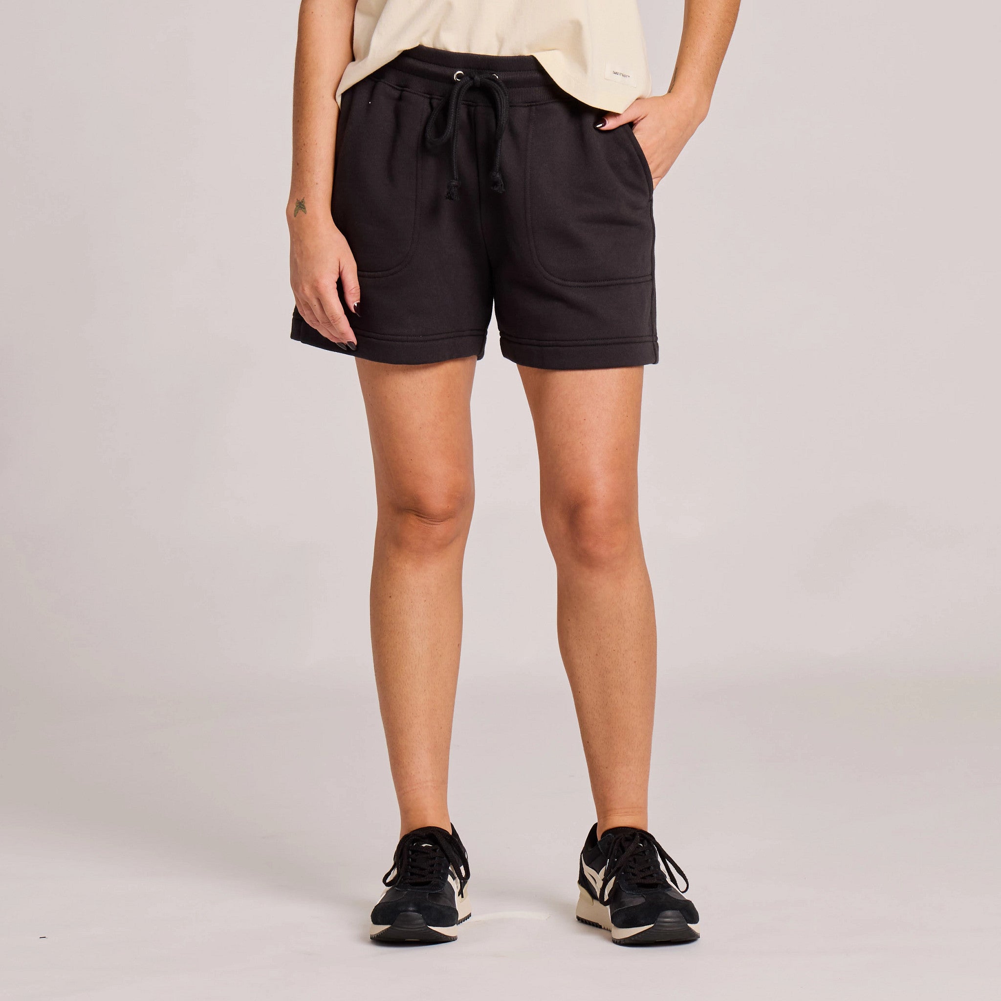 • Front slant pockets, stitched down to stay in place.