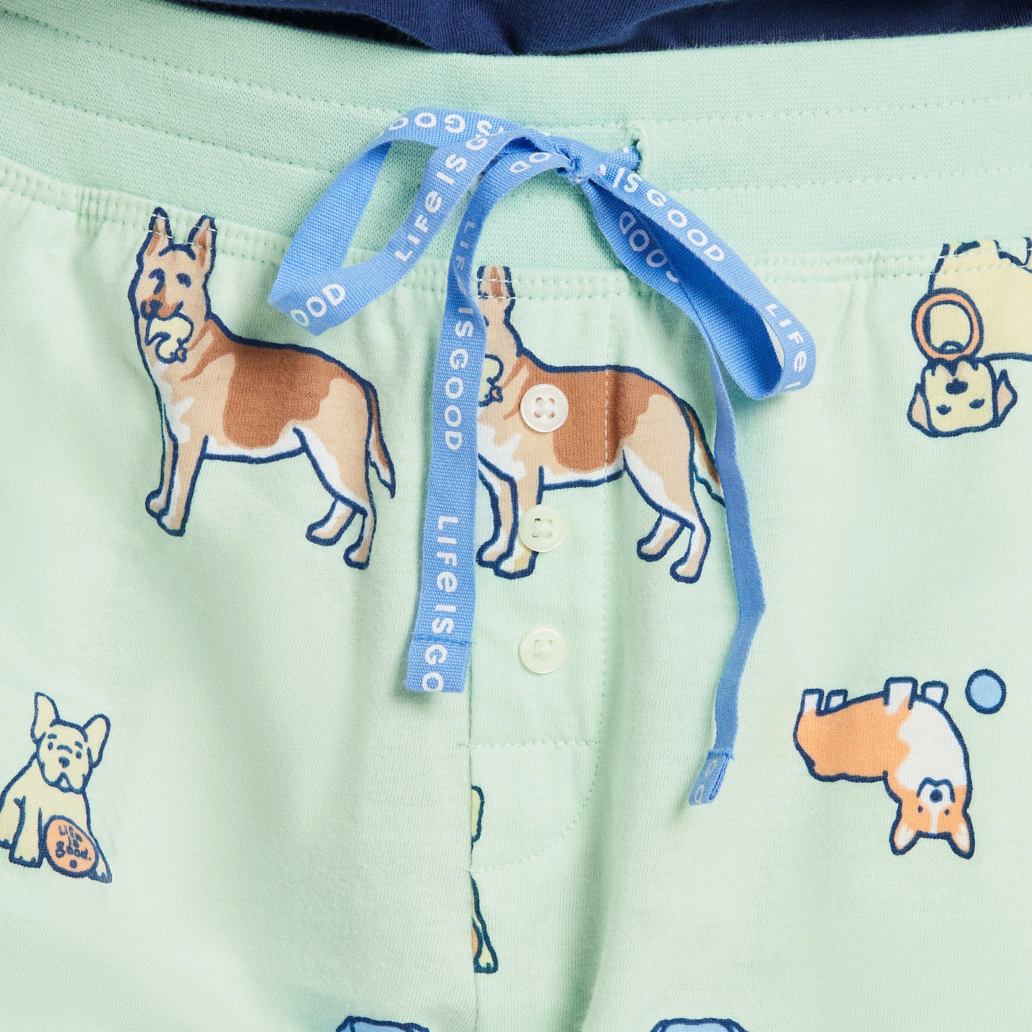 - Elastic encased rib waistband. Twill drawcord with Life Is Good® print.