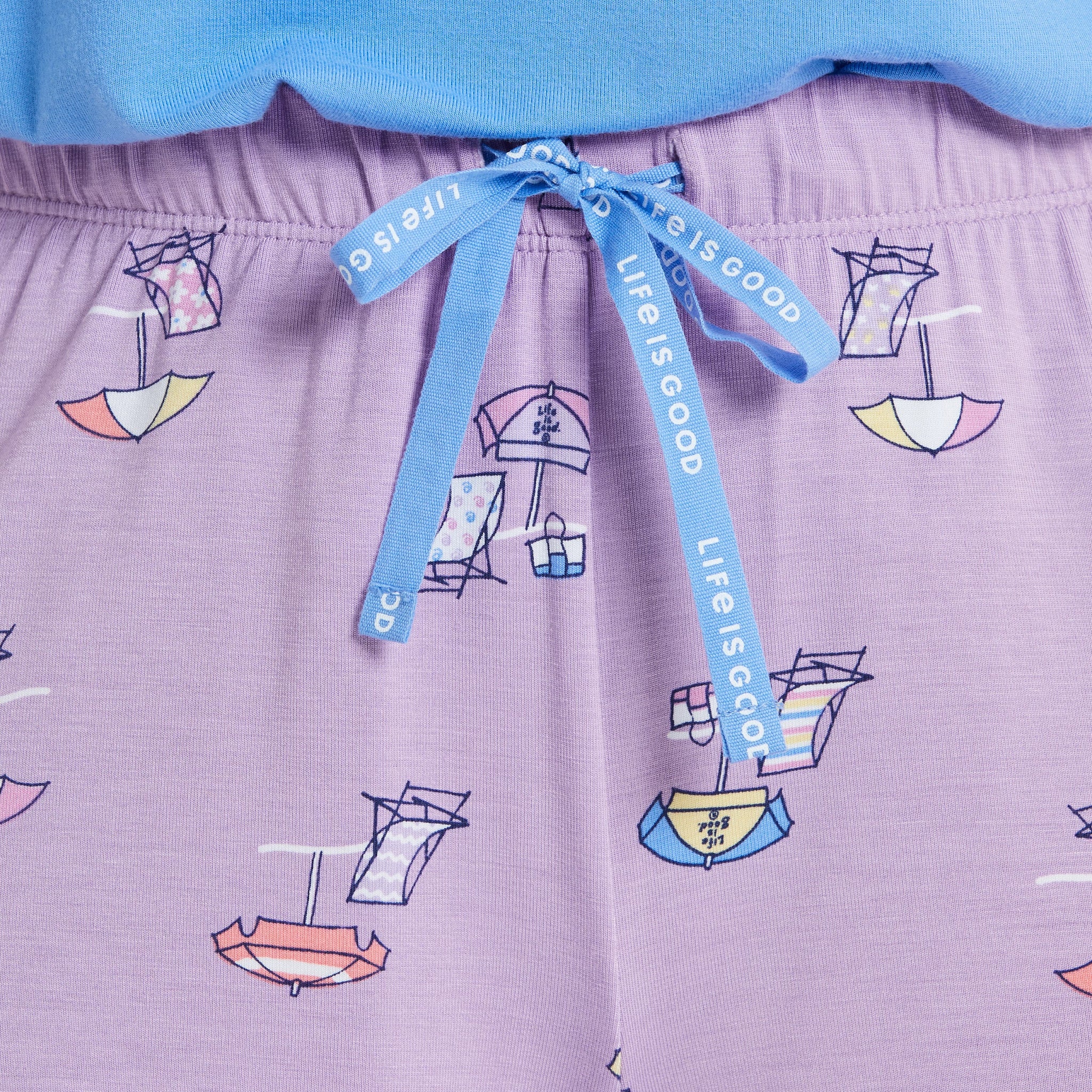 • Elastic encased waist band with Life Is Good® printed woven drawcord. Small side vent for added detail.