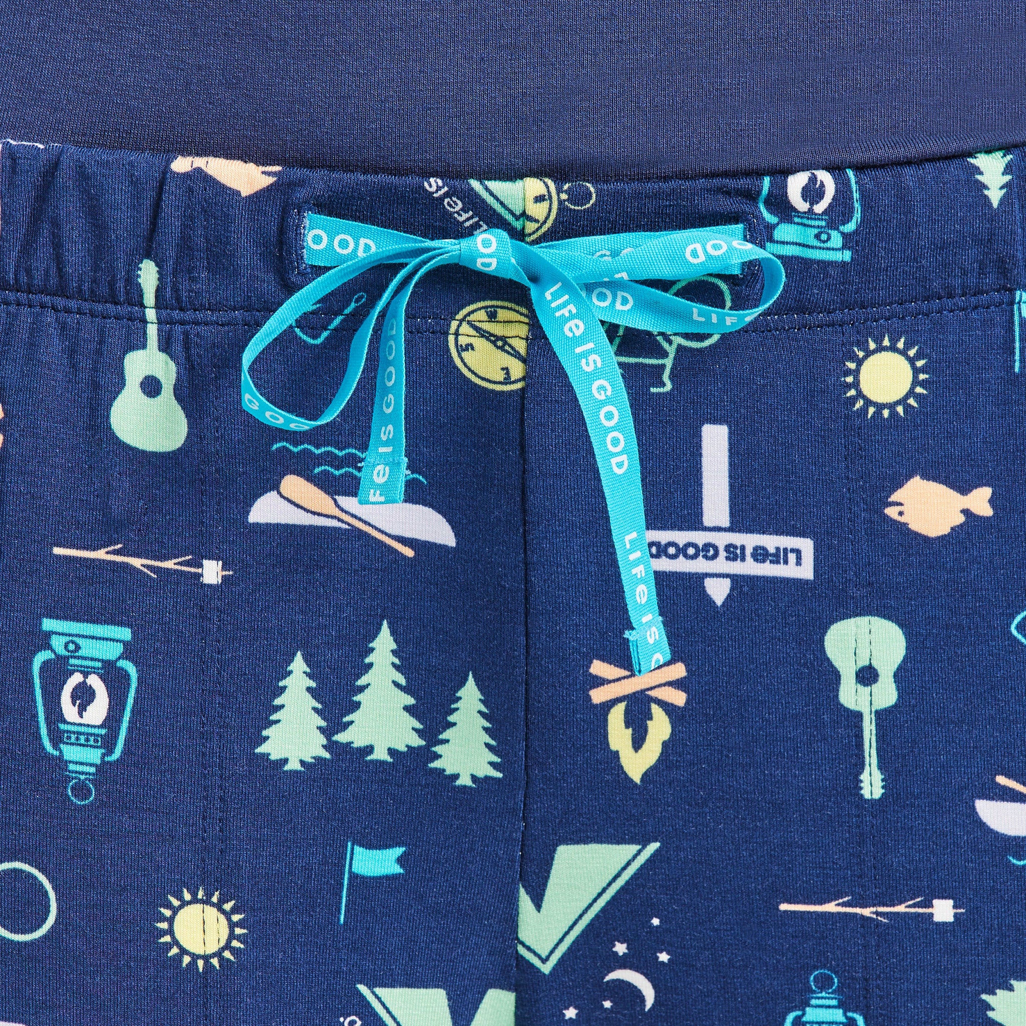• Elastic encased waist band with Life Is Good® printed woven drawcord. Slash pockets are stitched down to stay in place.